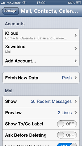 Vas a settings (Mail, contacts, calendar).