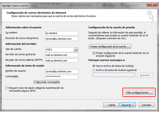Una vez relleno todos los campos seleccione Más configuraciones…, aparece en la imagen en el cuadro rojo: